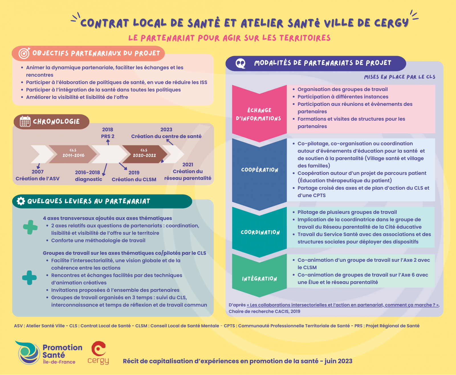 En 2011, la Ville de Cergy signe son premier Contrat Local de Santé (CLS) 2011-2016[2], avec l’Agence Régionale de Santé et la Préfecture de région d’Ile-de-France. Le CLS est piloté par le Service Santé, prévention, handicap et lien intergénérationnel, de la Direction du Développement Social et de la Santé de la Ville.